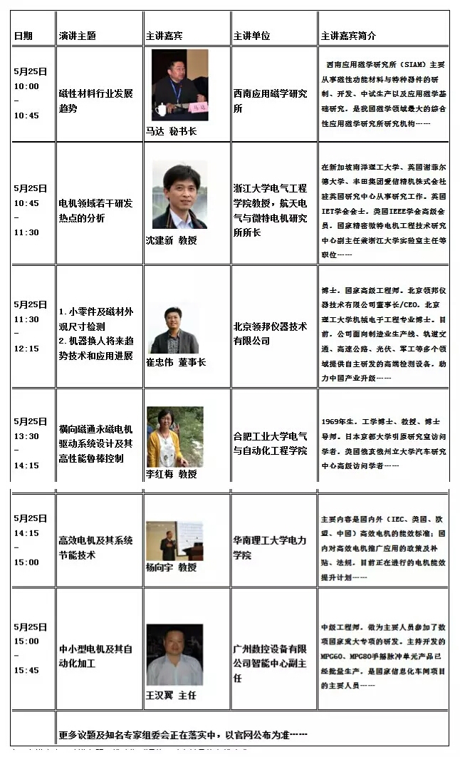 2016深圳國際微特電機(jī)及磁性材料創(chuàng)新與應(yīng)用技術(shù)論壇安排表 時(shí)間/地點(diǎn):2016年5月25日 ; 深圳會(huì)展中心 組織單位:廣東智展展覽有限公司 參會(huì)對(duì)象:國內(nèi)外微特電機(jī)制造商、磁性材料生產(chǎn)商﹑電機(jī)磁材應(yīng)用領(lǐng)域汽車、家電、自動(dòng)化、伺服控制等應(yīng)用領(lǐng)域工程師、機(jī)電工程師、采購經(jīng)理以及來自科研院校、行業(yè)協(xié)會(huì)的高級(jí)專家等。 演講議題