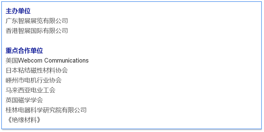 ●2017深圳國(guó)際小電機(jī)制造及應(yīng)用技術(shù)高峰論壇 ●2017深圳國(guó)際磁材供應(yīng)商大會(huì) ●2017深圳國(guó)際汽車(chē)電機(jī)發(fā)展及應(yīng)用研討會(huì) ●2017深圳國(guó)際小電機(jī)及電機(jī)工業(yè)磁性材料展覽會(huì) ●深圳國(guó)際小電機(jī)及磁性材料新產(chǎn)品、新技術(shù)發(fā)布會(huì) ●中國(guó)國(guó)際電子變壓器制造技術(shù)論壇 ●電子變壓器、電感主題沙龍