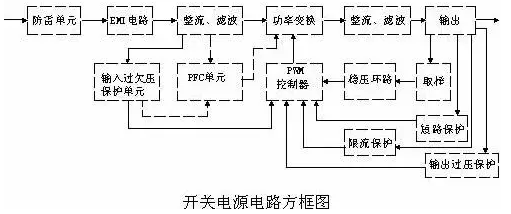 開關(guān)電源的主要電路是由輸入電磁干擾濾波器(EMI)、整流濾波電路、功率變換電路、PWM控制器電路、輸出整流濾波電路組成。輔助電路有輸入過欠壓保護(hù)電路、輸出過欠壓保護(hù)電路、輸出過流保護(hù)電路、輸出短路保護(hù)電路等。