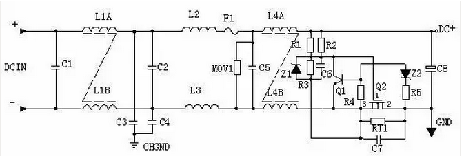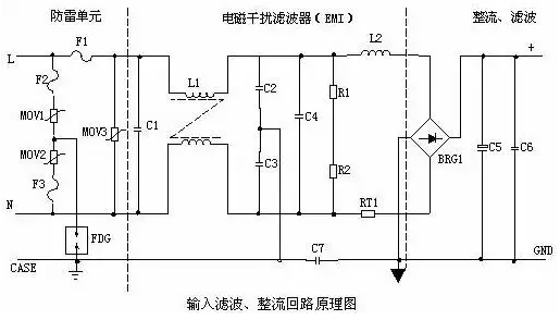 ①、輸入濾波電路:C1、L1、C2組成的雙π型濾波網(wǎng)絡(luò)主要是對(duì)輸入電源的電磁噪聲及雜波信號(hào)進(jìn)行抑制,防止對(duì)電源干擾,同時(shí)也防止電源本身產(chǎn)生的高頻雜波對(duì)電網(wǎng)干擾。C3、C4為安規(guī)電容,L2、L3為差模電感。