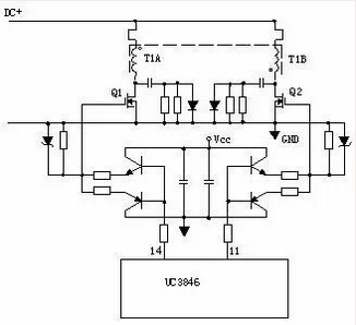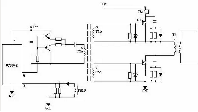 T2為驅(qū)動(dòng)變壓器,T1為開關(guān)變壓器,TR1為電流環(huán)。