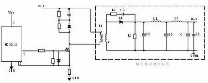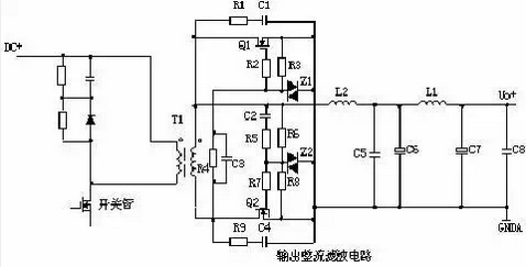 T1為開關(guān)變壓器,其初極和次極的相位同相。D1為整流二極管,D2為續(xù)流二極管,R1、C1、R2、C2為削尖峰電路。L1為續(xù)流電感,C4、L2、C5組成π型濾波器。