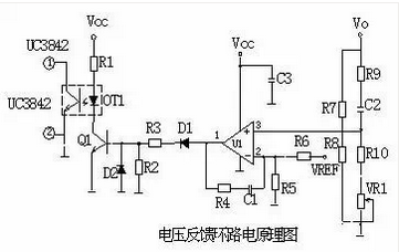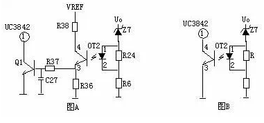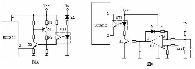 圖A的工作原理是,當(dāng)輸出電壓Uo升高,穩(wěn)壓管導(dǎo)通,光耦導(dǎo)通,Q2基極得電導(dǎo)通,由于Q2的導(dǎo)通Q1基極電壓降低也導(dǎo)通,Vcc電壓經(jīng)R1、Q1、 R2使Q2始終導(dǎo)通,UC3842③腳始終是高電平而停止工作。在圖B中,UO升高U1③腳電壓升高,①腳輸出高電平,由于D1、R1的存在,U1①腳始 終輸出高電平Q1始終導(dǎo)通,UC3842①腳始終是低電平而停止工作。