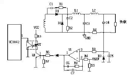 當(dāng)輸出U0升高,經(jīng)取樣電阻R7、R8、R10、VR1分壓后,U1③腳電壓升高,當(dāng)其超過U1②腳基準(zhǔn)電壓后U1①腳輸出高電平,使Q1導(dǎo)通,光耦 OT1發(fā)光二極管發(fā)光,光電三極管導(dǎo)通,UC3842①腳電位相應(yīng)變低,從而改變U1⑥腳輸出占空比減小,U0降低。當(dāng)輸出U0降低時(shí),U1③腳電壓降 低,當(dāng)其低過U1②腳基準(zhǔn)電壓后U1①腳輸出低電平,Q1不導(dǎo)通,光耦OT1發(fā)光二極管不發(fā)光,光電三極管不導(dǎo)通,UC3842①腳電位升高,從而改變 U1⑥腳輸出占空比增大,U0降低。周而復(fù)始,從而使輸出電壓保持穩(wěn)定。調(diào)節(jié)VR1可改變輸出電壓值。