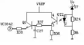 如上圖,當(dāng)Uo有過壓現(xiàn)象時(shí),穩(wěn)壓管擊穿導(dǎo)通,經(jīng)光耦(OT2)R6到地產(chǎn)生電流流過,光電耦合器的發(fā)光二極管發(fā)光,從而使光電耦合器的光敏三極管導(dǎo)通。Q1基極得電導(dǎo)通,3842的③腳電降低,使IC關(guān)閉,停止整個(gè)電源的工作,Uo為零,周而復(fù)始。