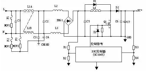 輸入電壓經(jīng)L1、L2、L3等組成的EMI濾波器,BRG1整流一路送PFC電感,另一路經(jīng)R1、R2分壓后送入PFC控制器作為輸入電壓的取樣,用以 調(diào)整控制信號(hào)的占空比,即改變Q1的導(dǎo)通和關(guān)斷時(shí)間,穩(wěn)定PFC輸出電壓。L4是PFC電感,它在Q1導(dǎo)通時(shí)儲(chǔ)存能量,在Q1關(guān)斷時(shí)施放能量。D1是啟動(dòng) 二極管。D2是PFC整流二極管,C6、C7濾波。PFC電壓一路送后級(jí)電路,另一路經(jīng)R3、R4分壓后送入PFC控制器作為PFC輸出電壓的取樣,用以 調(diào)整控制信號(hào)的占空比,穩(wěn)定PFC輸出電壓。