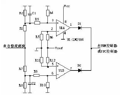 AC輸入和DC輸入的開關(guān)電源的輸入過欠壓保護(hù)原理大致相同。保護(hù)電路的取樣電壓均來自輸入濾波后的電壓。取樣電壓分為兩路,一路經(jīng)R1、R2、R3、 R4分壓后輸入比較器3腳,如取樣電壓高于2腳基準(zhǔn)電壓,比較器1腳輸出高電平去控制主控制器使其關(guān)斷,電源無輸出。另一路經(jīng)R7、R8、R9、R10分 壓后輸入比較器6腳,如取樣電壓低于5腳基準(zhǔn)電壓,比較器7腳輸出高電平去控制主控制器使其關(guān)斷,電源無輸出。