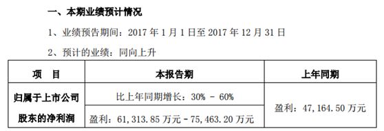 1月21日,易事特集團(tuán)股份有限公司發(fā)布 2017 年度業(yè)績(jī)預(yù)告,2017年歸屬于上市公司 股東的凈利潤(rùn)為:61,313.85 萬元–75,463.20 萬元,2016年同期盈利:47,164.50 萬元,比2016年同期增長(zhǎng):30% - 60%。