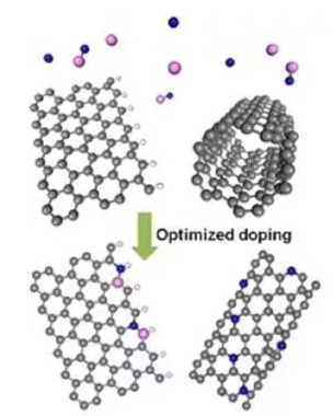 據(jù)發(fā)現(xiàn),由于摻雜劑之間的相互作用以及化學(xué)鍵的變形,氮摻雜多的超薄碳納米管能夠最有效地發(fā)揮作用。納米管在這方面比納米帶好,因為它們的曲率,扭曲了化學(xué)鍵的邊緣使其更容易結(jié)合。他們發(fā)現(xiàn)半徑在7至10埃之間的超薄納米管是最理想的。